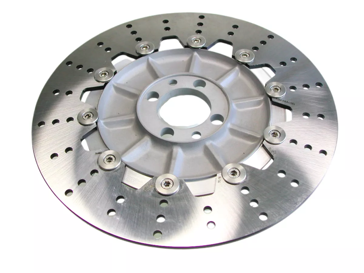 Zuerst wird der verschlissene Bremsscheibenring von dem original Bremsscheibenträger demontiert. Nach erfolgreicher Prüfung des Trägers, wird dieser gestrahlt und geplant. Dann wird ein hochwertiger Bremsscheibenring mit Edelstahlfloatern halbschwimmend montiert.