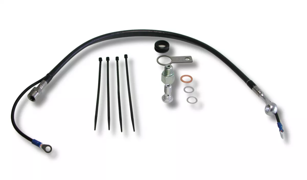 Lieferumfang: Öldruckleitung mit integriertem Kontrollanschlusskabel, ein Halter für den Druckgeber und notwendige Anschlussteile.