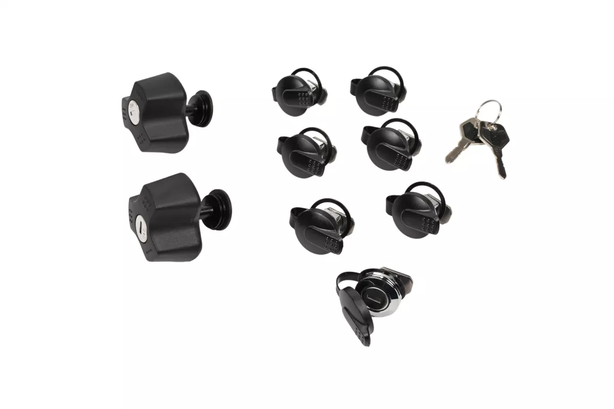 Der TRAX Schloss-Satz mit Diebstahlsicherung besteht aus den drei Schlössern zum Abschließen der Kofferdeckel, drei weiteren Schlössern zum Abschließen der Koffer an den Seitenträgern, einem Schloss für die Werkzeugbox sowie zwei Diebstahlsicherungen mit Schlössern für EVO Seitenträger.