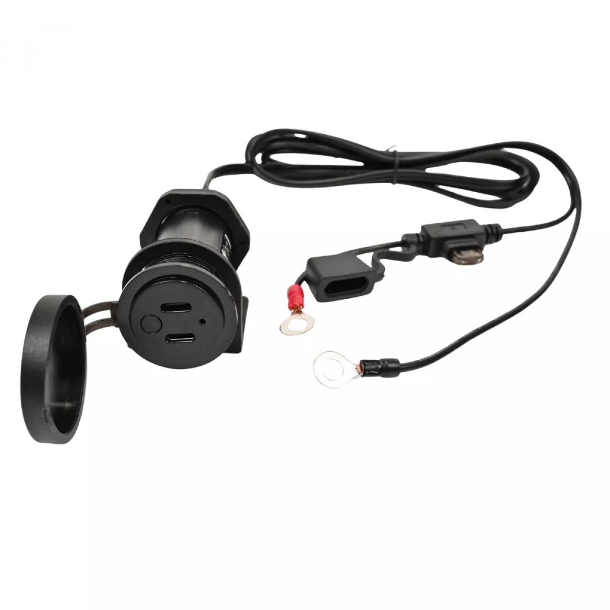 Die USB-Twin Bordsteckdose setzt die Eingangsspannung von 12/24V Bordnetzen auf USB-Standard 5V um. Sie hat 2 USB-C Ausgangsbuchsen und bietet hier zusammen eine maximale Ladeleistung von 3,6A QC Quickcharge. Über den Zentralschalter sind die Ausgangsbuchsen komplett abschaltbar, um die Fahrzeugbatterie nicht unnötig zu entleeren. Die Betriebsbereitschaft wird mit einer grünen LED signalisiert.
